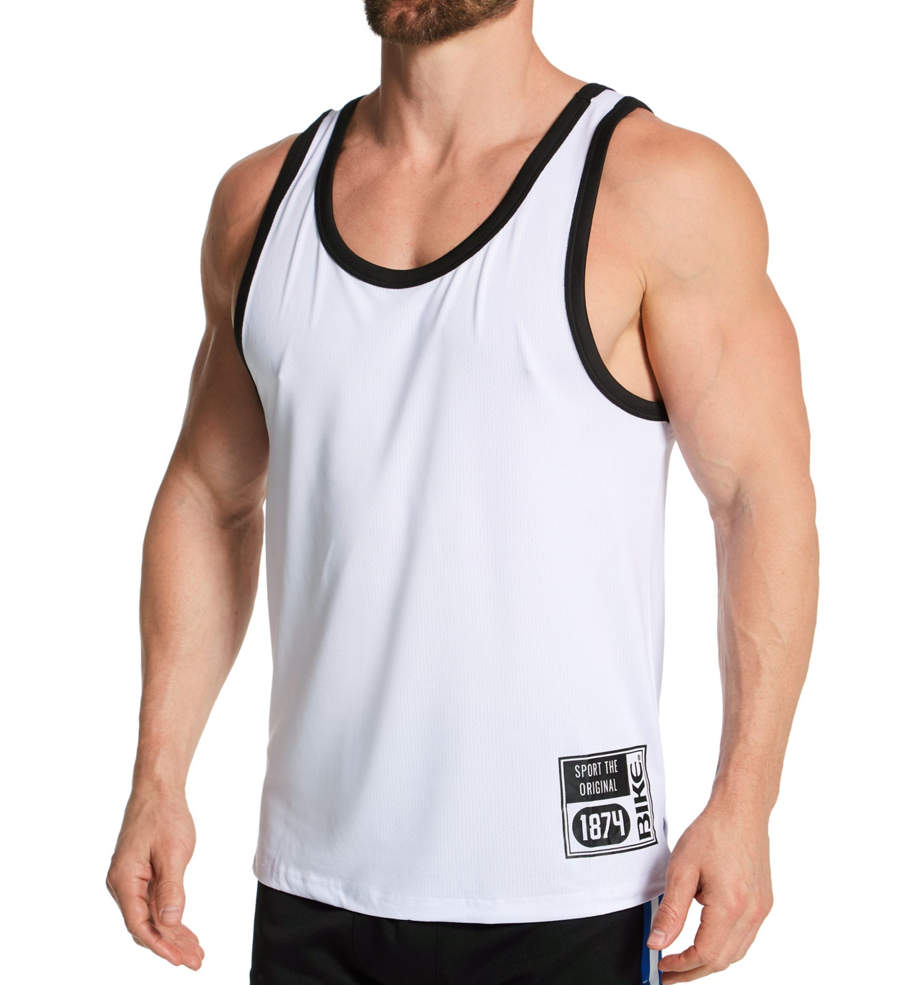 The Bike Cool Mesh Tank BAM132 is pinhole mesh with contrast ribbed knit edges along armholes and scoop neckline. Lower left of top has silkscreen graphic. Tag-free tank top features fitted styling. Bike's Cool Mesh Tank is made of knit polyester/spandex.